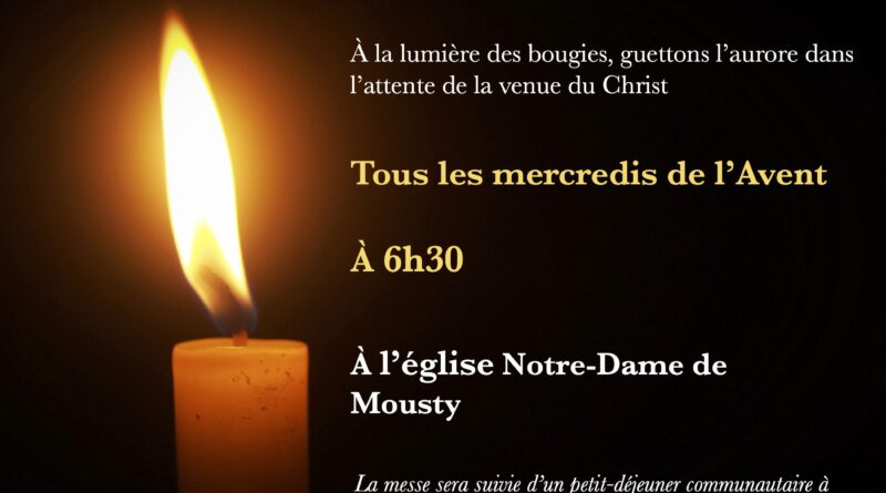 A la seule lumière des bougies, une messe Rorate est célébrée tous les mercredis de l’Avent à 6h30 à l’église de Mousty. La messe sera suivie d’un petit-déjeuner communautaire à l’Espace Notre-Dame (en face de l’église). Une occasion de veiller ensemble, de mettre de « l’extra ordinaire » dans notre ordinaire, d’éveiller nos sens pour accueillir le Seigneur qui vient !